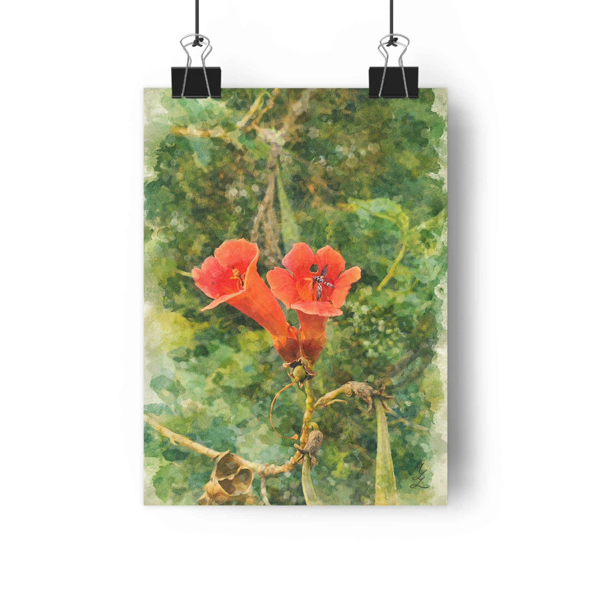 Two trumpet flowers rise from a softened field of green, their warm tones held briefly against a dissolving background. Painted in a traditional watercolor style, the surrounding foliage loosens into layered washes, allowing the flowers and their small visitor to remain gently present.