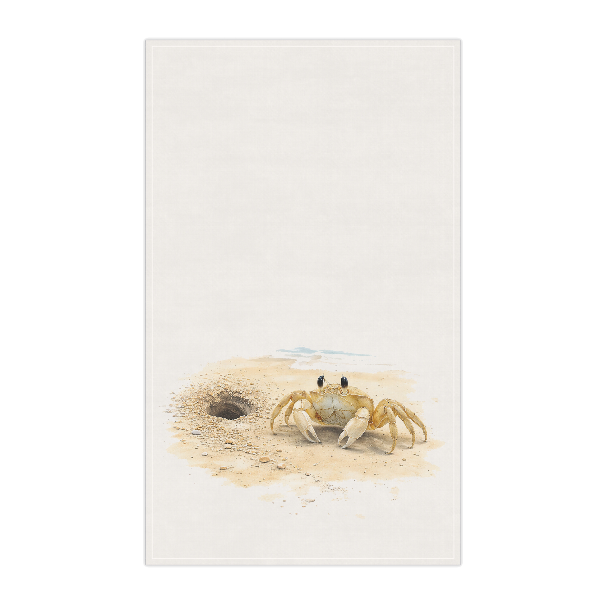 A ghost crab pauses at the edge of its burrow, pale sand shifting softly around it. The illustration captures a fleeting coastal moment, alert, still, and lightly grounded, rendered in muted tones that feel natural and unforced.