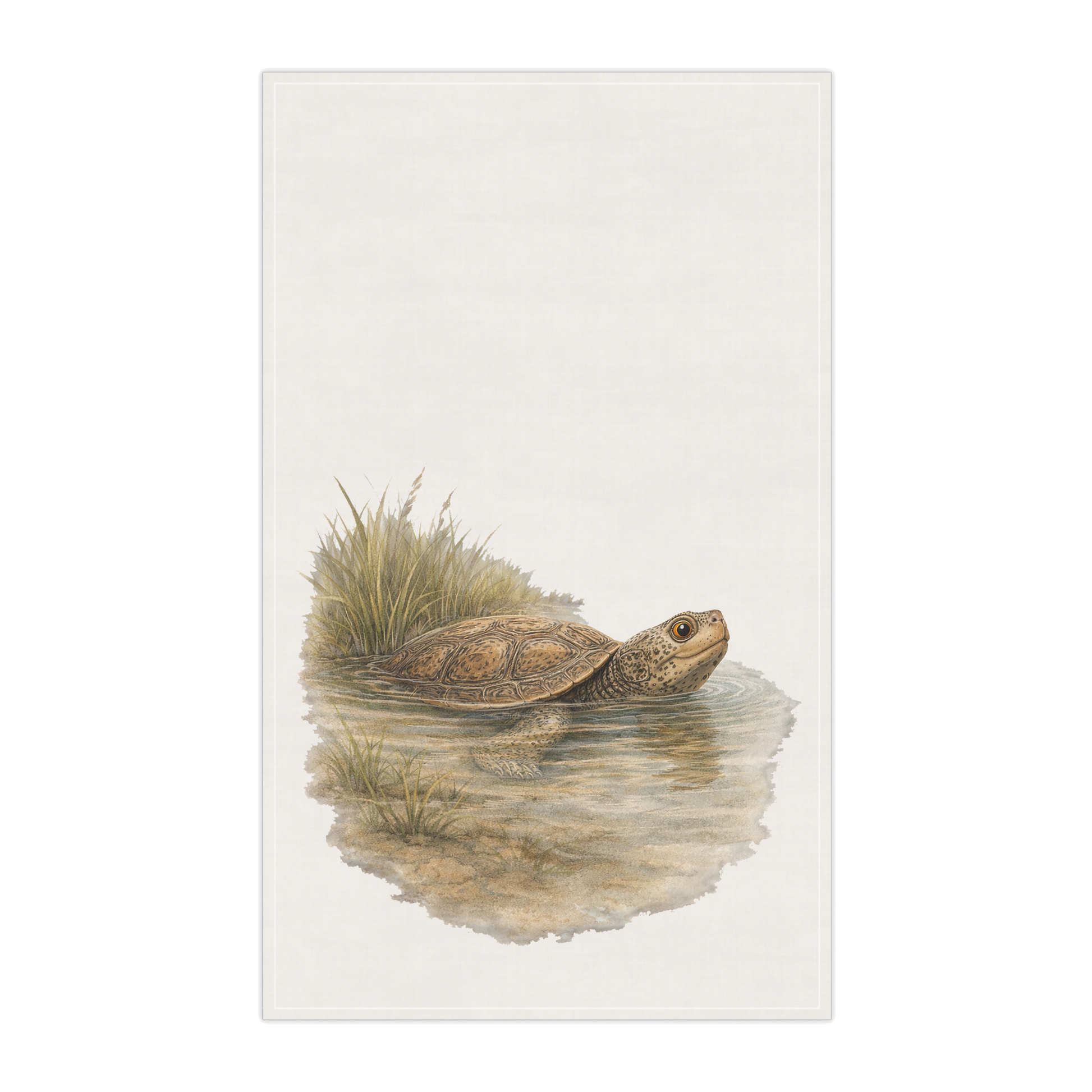 A quiet marsh scene unfolds as a painted turtle rests at the water’s edge, partially submerged and unhurried. Rendered in soft, earthy tones, the illustration carries a hand-drawn, observational quality that brings a sense of stillness into everyday spaces without demanding attention.