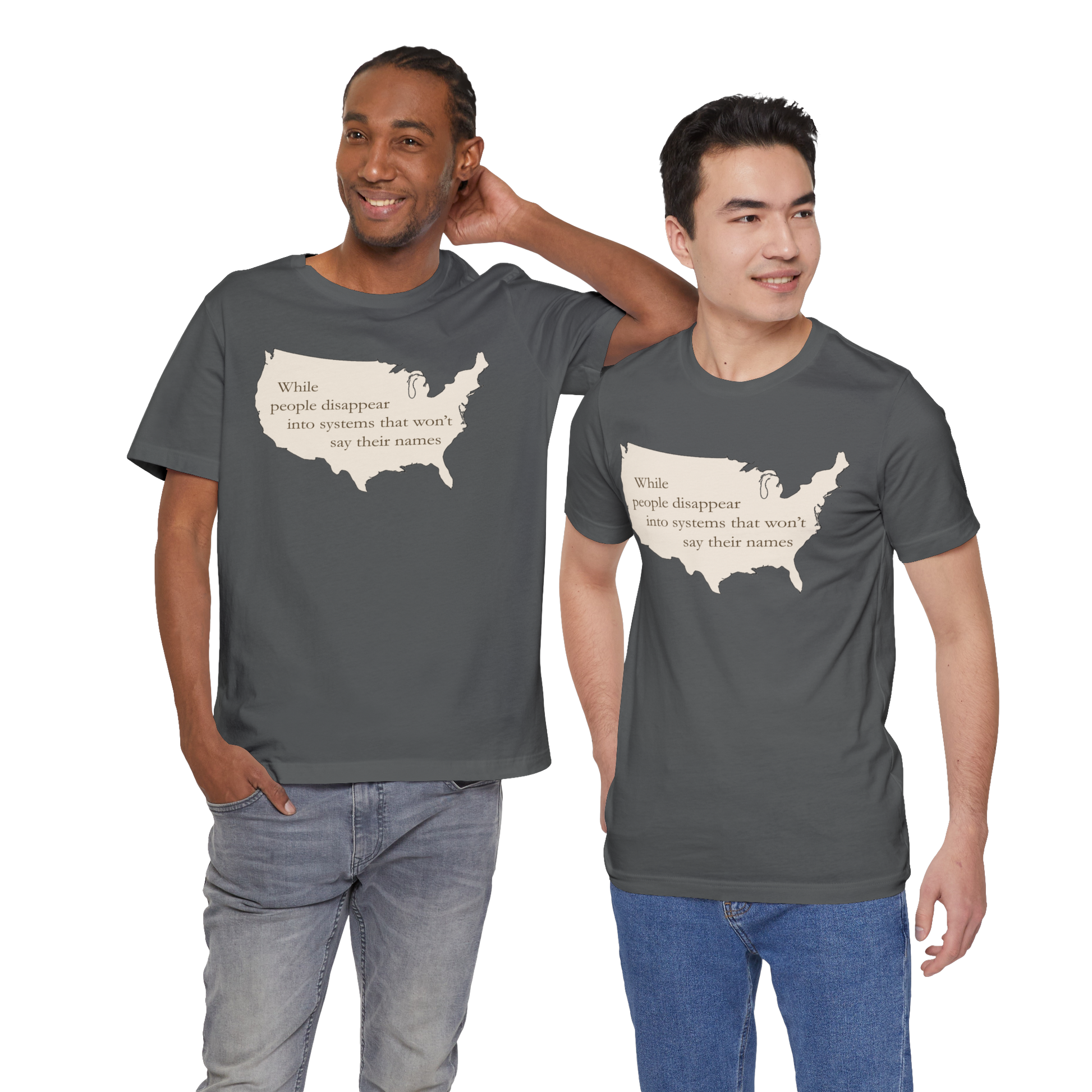 A quiet statement rendered without ornament or emphasis. The outline of the United States appears as a single, unbroken form, holding a sentence that points to what is lost when people are absorbed into systems that refuse to acknowledge them.